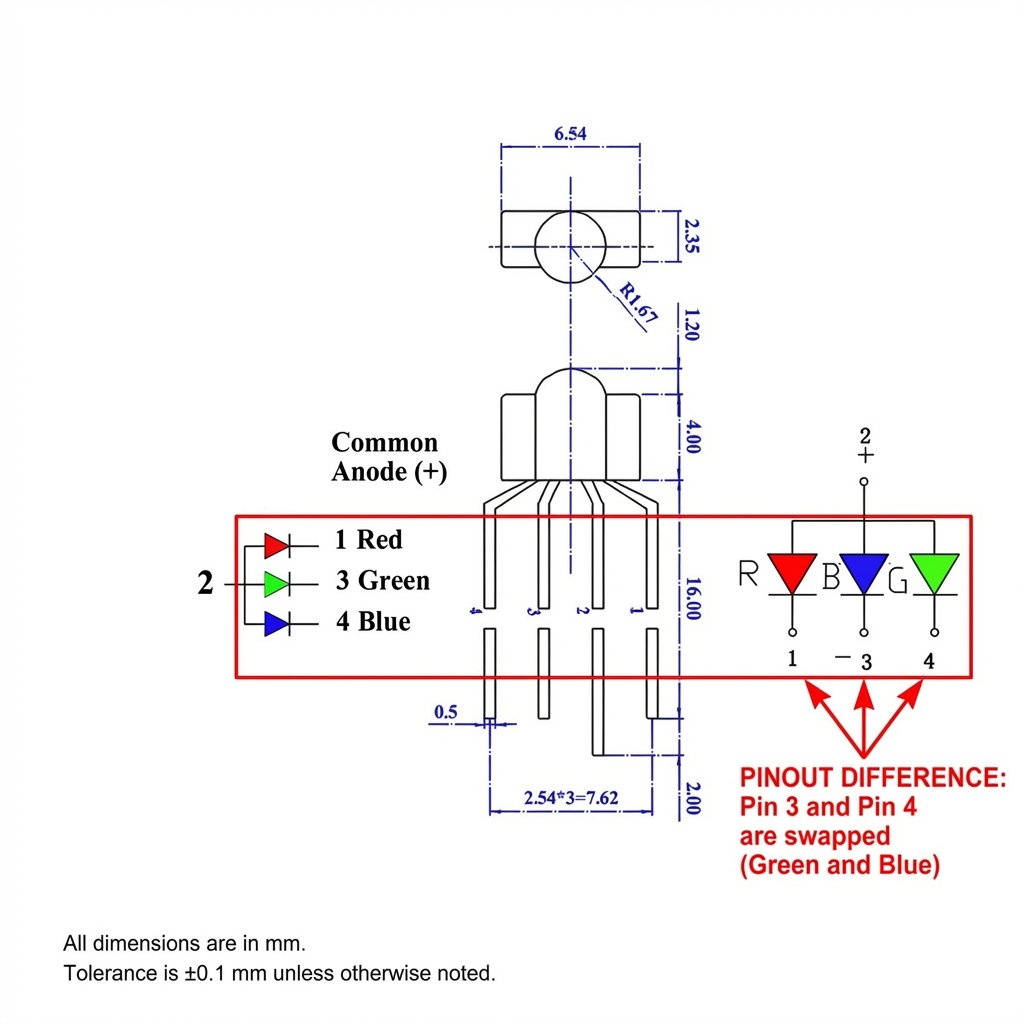 RGB and RBG LEDs differ in their pin configuration – specifically, the order of their leads: