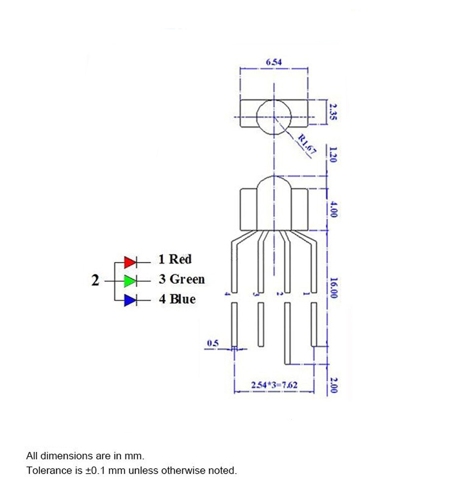 3MM 4pin Diffused RGB Tri-Color Red Green Blue LEDs Common Anode Nipple Pkg at Envistia Mall