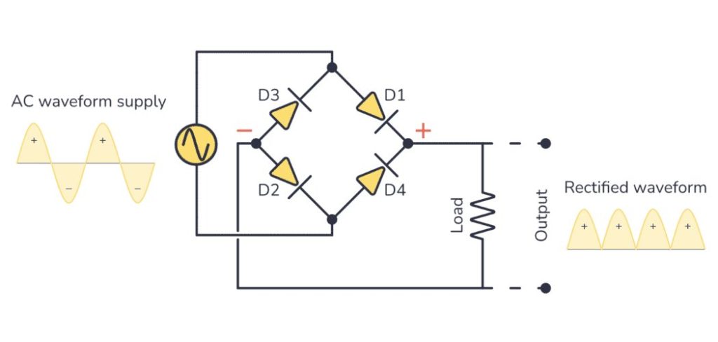 To rectify both half-cycles of a sine wave, the KBPC5010 bridge rectifier uses four diodes, connected together in a “bridge” configuration. The secondary winding of the transformer is connected on one side of the diode bridge network and the load on the other side. The image below shows the bridge rectifier circuit, and the resulting input and output voltage waveforms. To smooth the resulting pulsating DC current use a filter, most often a high-capacity capacitor, connected to the output.